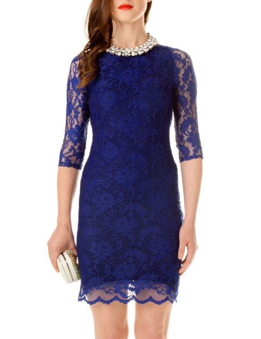 Show off your pins in this gorgeous lace dress. This piece features a round neckline, three quarter length sleeves and an open back.