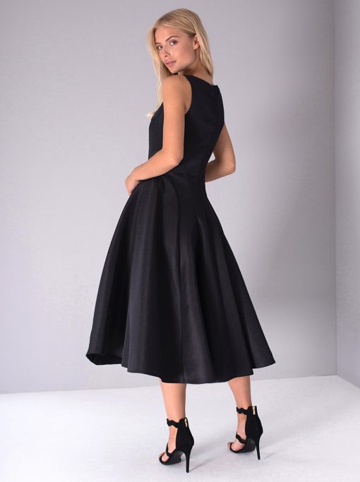 Keep it classy in this classic black midi dress. Featuring a fitted bodice, a scooped neckline and a pleated midi skirt.