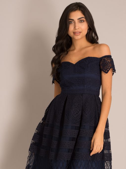 Make sure you’re looking super stylish and on point with this gorgeous navy crochet midi dress- features an all over patterned crochet design, a bardot sleeve style, a padded bust with a sweetheart neckline and midi skirt with mesh inserts. Crochet is going to be the staple must have for spring and summertime, so make sure you get this beauty in your wardrobe ASAP