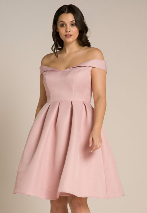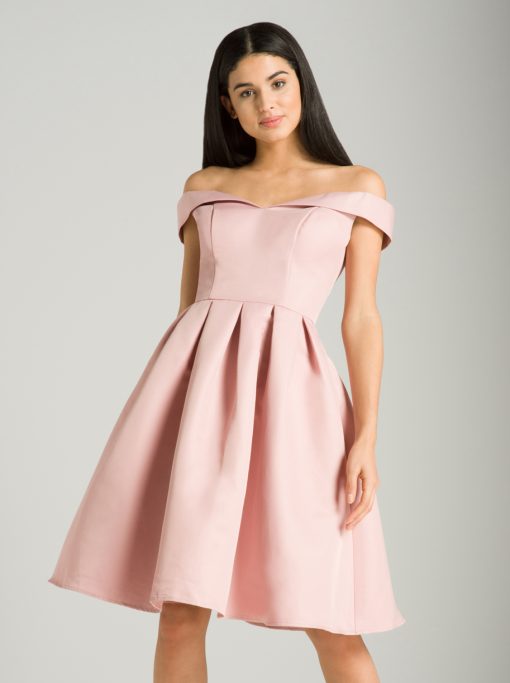 Go girlie in this cute bardot midi- featuring a fitted bodice with fold-over sleeve detailing, and a box pleated skirt.